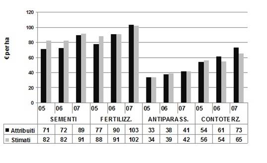 Figura 2 - Costi attribuiti e stimati di sementi, fertilizzanti, antiparassitari e contoterzismo per il grano duro (2005-2007)