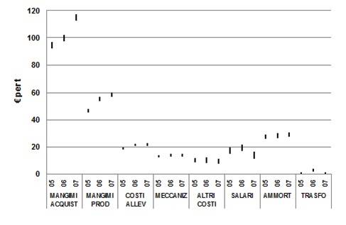 Figura 3 - Stima dei valori massimi e minimi delle principali voci di costo per il latte vaccino in Italia (2005-2007)