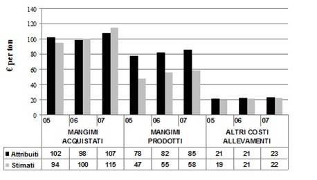 Figura 4 - Costi attribuiti e stimati di mangimi acquistati, mangimi prodotti e altri costi specifici degli allevamenti per il latte vaccino (2005-2007)