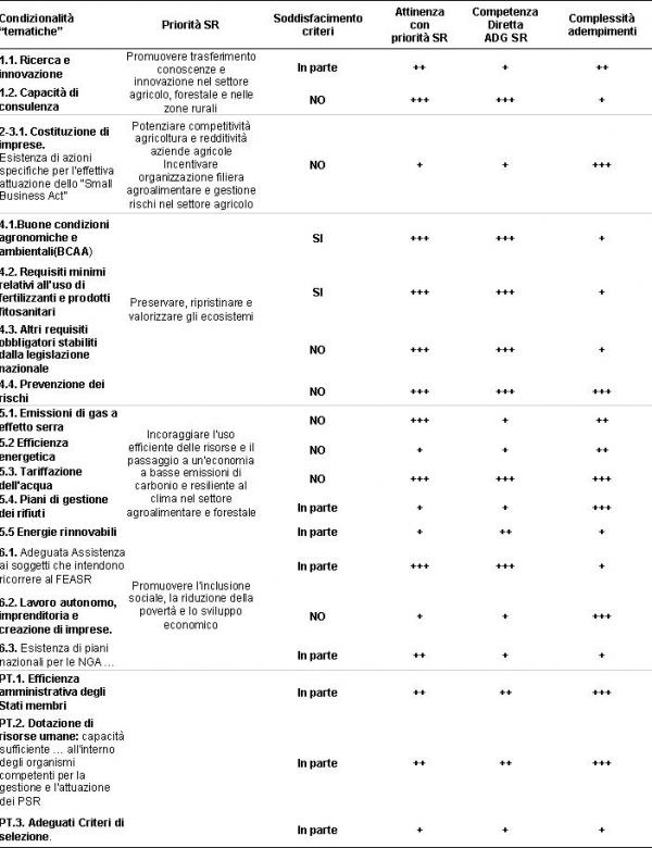 Alla luce delle considerazioni sovraesposte, nelle tabelle 1 e 2 sono messe a confronto le diverse precondizioni previste nelle proposte di regolamento, proponendo una prima valutazione qualitativa dello stato dell’arte del sistema Italia sulla base dei seguenti elementi: (a) grado di recepimento della condizionalità e rispetto ai diversi criteri di valutazione proposti dalla Commissione europea; (b) livello di coerenza con le priorità definite per la politica di sviluppo rurale; (c) centro di competenza (nazionale, regionale, ripartito tra più amministrazioni, direttamente legato all’attuazione del Psr); (d) grado di complessità nel recepimento di un adempimento non ancora soddisfatto o delle attività da soddisfare nelle more del recepimento. I segni nelle colonne indicano il livello di intensità (alto, medio, basso) rispetto alle diverse dimensioni analizzate e sono stati assegnati sulla base di giudizi formulati da esperti di settore e da referenti regionali delle politiche.