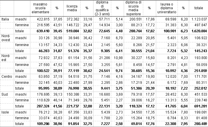Le differenze a livello regionale non sono molto significative ad esclusione del nord-ovest, dove si riscontra una minore presenza di capoazienda con al massimo la licenza elementare, pari al 31,87%, a favore dei titoli di studio intermedi (scuola media, triennio professionale e maturità) e una più bassa presenza di laureati (5,32) rispetto alla media. Il nord-est presenta invece il più alto livello di capoazienda con qualifica triennale (9,74%), ma la quota più bassa di laureati (4,36%). Nelle isole, a fronte di una quota consistente di persone con al massimo la licenza media (40,6%) si riscontra la presenza di laureati superiore alla media (quasi 8%).
