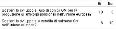Alla fine dell'evento, ai giurati è stato chiesto di votare se fossero a favore dello sviluppo e vendita di salmone GM nell'Unione europea e dello sviluppo e uso di conigli GM per la produzione di anticorpi policlonali nell'Unione europea (Tabella 1).