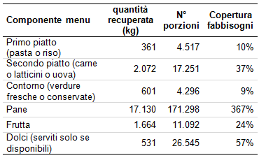 Tabella 1 - Stima dell’impatto dei recuperi sui fabbisogni alimentari della mensa