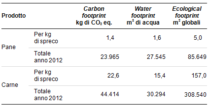 Nella tabella 2 viene valutato tramite coefficienti standard l’impatto ambientale in termini di Carbon footprint, Water footprint ed Ecological footprint di due prodotti rappresentativi – pane e carne – dello spreco recuperato all’interno del progetto viterbese.