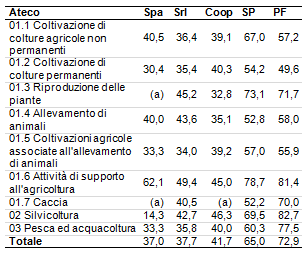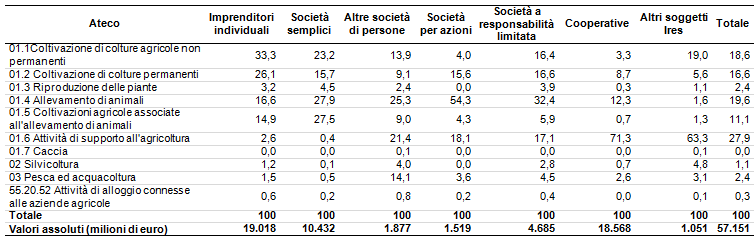 Nella tabella 1 è riportata la distribuzione per tipologia giuridica e per codice Ateco a una cifra del volume d’affari dichiarato nel 2010 a livello nazionale per tutti gli imprenditori con un volume d’affari superiore a 7000 euro; nella tabella 2 sono riportate le quote relative.