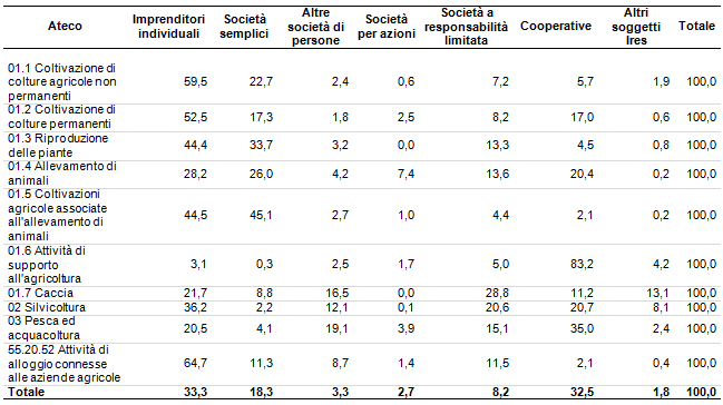 Tabella 1 - Agricoltura, Caccia, Silvicoltura, Pesca - Distribuzione del volume d'affari per tipologia giuridica degli imprenditori (Anno 2010)