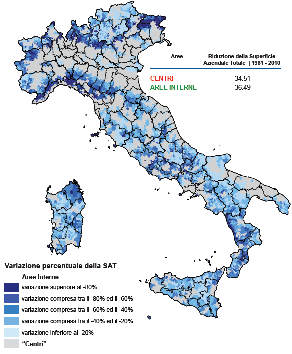 Figura 1 - Riduzione percentuale della Sat (Superficie Aziendale Totale) tra il 1961 ed il 2010 nelle aree interne