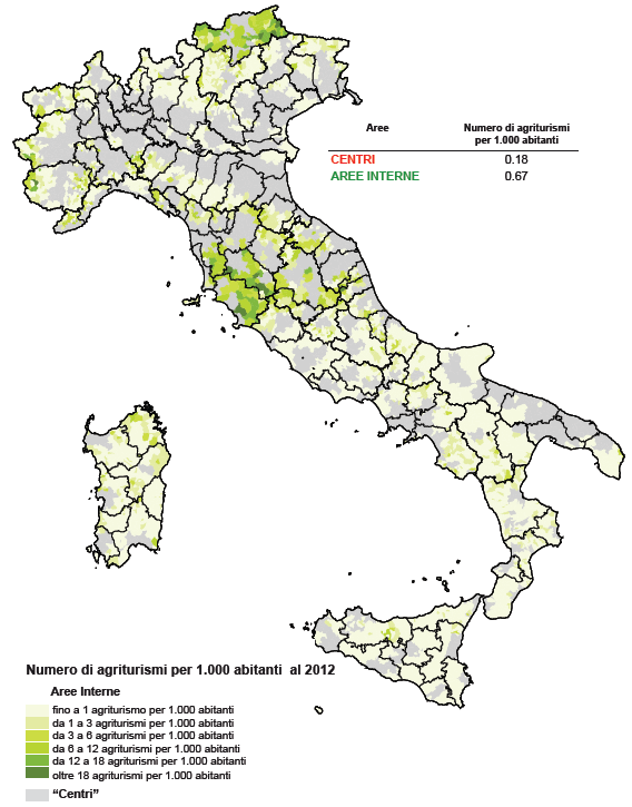 Le aree interne propongono a questo riguardo importanti condizioni di vantaggio, proponendo da un lato una intensità decisamente più marcata della ospitalità rurale con una densità di 6,7 esercizi agrituristici per 10.000 abitanti contro la dotazione di 1,8 esercizi per 10.000 abitanti del restante territorio nazionale. Le specificità regionali sono naturalmente molto marcate con Provincia Autonoma di Bolzano, Toscana, Umbria e, un po’ più discoste, le Marche.