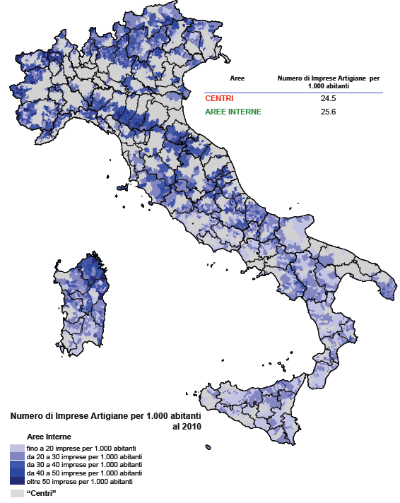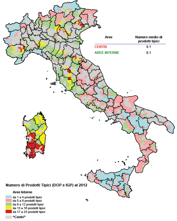 Diversa la geografia che si propone riguardo alla capacità di valorizzare le risorse agro-alimentari del territorio promovendo il riconoscimento di regimi di tipicità geografica del prodotto e conseguentemente percorsi per la sua valorizzazione: a questo riguardo aree interne ed aree della armatura urbana sono sostanzialmente allineate con una media di 8,1 prodotti tipici riconosciuti in media in ciascuno dei comuni delle aree interne contro i 9,1 prodotti presenti in media negli altri comuni.