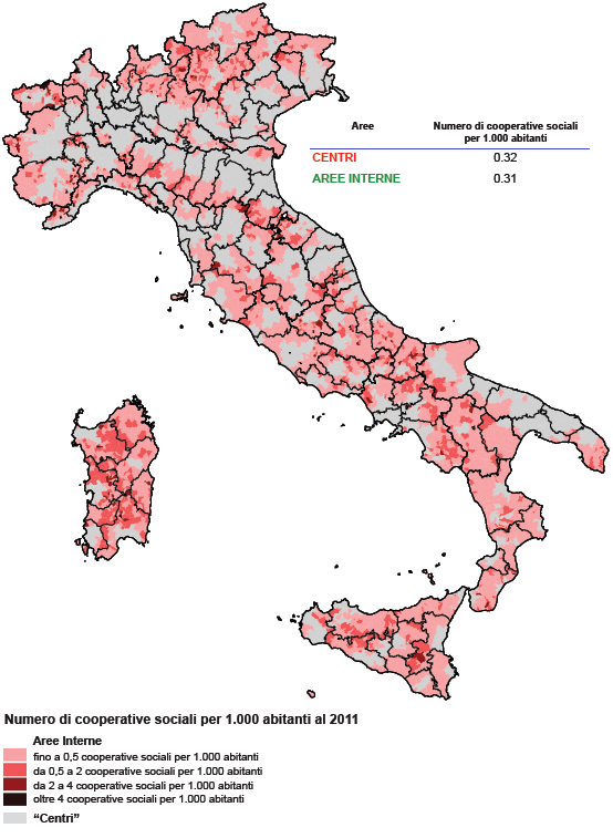 Un soggetto, la cooperazione sociale, che nelle aree interne presenta un radicamento non inferiore a quello dei territori metropolitani (con 3,1 cooperative sociali per 10.000 abitanti nelle aree interne contro le 3,2 cooperative per 10.000 abitanti presenti in media nei restanti territori a più marcata connotazione metropolitana ed urbana).