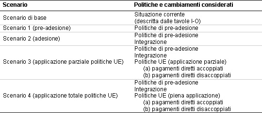 In particolare, lo scenario (c) prevede la sola entrata dei paesi candidati nell’UE senza l’applicazione delle varie politiche comunitarie. Di conseguenza, gli effetti analizzati sono soltanto quelli dell’integrazione nell’UE. Lo scenario (d), il più realistico fra tutti, prevede l’applicazione dello schema di attribuzione graduale dei pagamenti diretti (phase-in scheme) nonché l’applicazione di tutte le altre politiche di pre-adesione (Sapard, Ispa, Cards, Phare) e adesione (sostegno al mercato, politica strutturale, di sviluppo rurale, di coesione). Lo scenario (e) ipotizza invece una piena attribuzione dei pagamenti diretti a partire dal primo anno di adesione ed è introdotto per valutare la perdita di benefici che i paesi considerati subiscono a seguito dell’accettazione del phase-in scheme. Sia lo scenario (d) che lo scenario (e) prevedono due ipotesi: pagamenti diretti integralmente accoppiati e pagamenti diretti totalmente disaccoppiati. L’introduzione delle due diverse ipotesi permette di stimare costi e benefici derivanti dall’uno e dall’altro regime. Ai fini della valutazione degli impatti, due differenti impostazioni metodologiche sono state applicate: una analisi I-O tradizionale (statica) e una analisi cosiddetta dinamica che tiene conto dei possibili cambiamenti tecnologici e degli effetti dell'integrazione. L’analisi è stata effettuata su di un orizzonte temporale va dal 2004 al 2013.