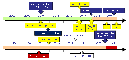 Facciamo il punto sulla Pac. La figura qui sotto, nella parte superiore, ricorda i momenti salienti del processo decisionale e dell’avvio della Pac 2014-20. In quella inferiore, il tempo è spostato in avanti a rappresentare il processo che porterà alla futura Pac dal 2021 in poi. Seppure siamo ancora in fase di implementazione dell’attuale Pac, è già tempo, come si vede, di pensare al futuro, se non si vogliono ripetere i ritardi di questa volta. Anche perché, inevitabilmente, il rinnovo della Commissione nel 2018 e del Parlamento europeo nel 2019 imporranno degli stop and go.