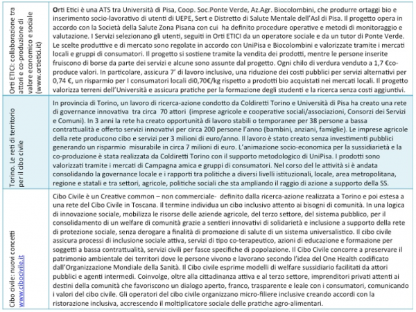 L’Aup, e il suo legame con i temi della SS, rappresenta un banco di prova interessante per il dialogo tra città e campagna e intorno ad essa si sviluppano innovazioni che investono la formazione di nuova conoscenza collettiva. Questa nuova conoscenza si realizza attraverso processi di brokeraggio di reti multiattoriali e multicompetenti, dove ricercatori, operatori economici, cittadinanza, operatori sociali, istituzioni e consumatori, interagiscono nella definizione di principi, regole, attitudini e modalità operative intorno a un obiettivo comune. Al centro della costruzione di sentieri di lavoro capaci di rispondere alle sfide odierne, c’è una nuova formulazione, non dei diritti, quanto nei modi di assicurarli, anche grazie al concorso delle risorse agricolo/rurali mobilizzate a vantaggio dei bisogni dei cittadini. All’interno di questi sentieri temi come l’accesso al cibo, alla salute, l’equità e l’inclusione, il consolidamento delle reti di comunità diventano beni comuni, frutto della responsabilità estesa e della capacità collettiva di assicurarne l‘evoluzione e la continuità nel tempo a fronte delle sfide odierne. Che si tratti di innovazione possibile è evidente dalle pratiche in atto che, in numero sempre più ampio, dimostrano quanto lo sforzo di cambiamento, sia possibile,, sia dal punto di vista aziendale (Orti Etici) e di territorio (Caso di Torino), sia nella formulazione di nuovi concetti e microfiliere agro-alimentari (Cibo Civile) (Tabella 3).