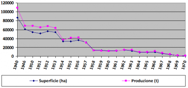 Se nei primi decenni del secolo scorso, l’Italia risultava al secondo posto (dopo la Russia) per superficie coltivata e produzione complessiva e al primo posto per resa a ettaro, dopo la seconda guerra mondiale questa coltura ha subito un forte declino e una rapida perdita di importanza, a causa della fine del regime di autarchia e della mancata meccanizzazione del processo di trasformazione (Somma, 1923; Capasso, 2001; Di Candilo, Ranalli, 2006). Dal 1940 al 1970, le superfici sono passate, così, da 86.850 a 899 ettari e la produzione da 109.200 a 1.080 tonnellate (Figura 1).