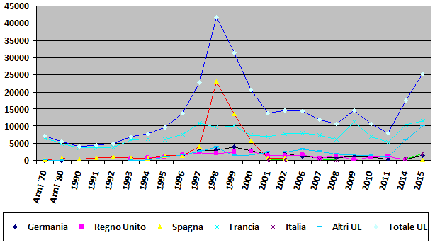 A livello europeo solamente Francia e Spagna non hanno praticamente mai interrotto la coltivazione, sebbene con andamenti molto diversi (Figura 2).