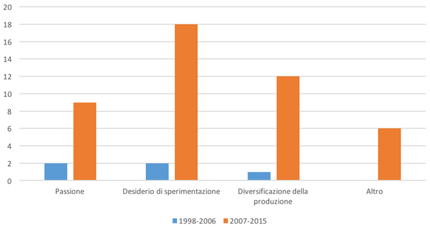 Tra le motivazioni che hanno spinto gli imprenditori a iniziare le coltivazioni di canapa vi sono, nel primo periodo considerato, la passione e il desiderio di sperimentazione, seguite dalla diversificazione della produzione. Negli anni più recenti, invece, prevale nettamente l’obiettivo di diversificare l’ordinamento aziendale e compaiono altri tipi di fattori determinanti, quali la volontà di tutelare il territorio, creare nuove filiere locali o rilanciare questa coltura sul mercato (Figura 3).
