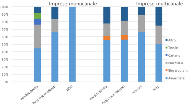 A proposito del settore di vendita dei prodotti finali, è interessante segnalare come quello alimentare rappresenti quello più diffuso (80%). In particolare, i produttori che si rivolgono a negozi specializzati commercializzano sempre prodotti alimentari e il 38% di essi anche prodotti nutraceutici, cosmetici, fitofarmaceutici o destinati ai settori della bio-edilizia e delle bio-plastiche.