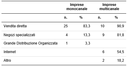Relativamente ai canali di distribuzione, il 73,2% delle aziende è monocanale, con una netta prevalenza della vendita diretta, che risulta la modalità più diffusa anche tra quelle multicanale, affiancata, nella maggior parte dei casi, da quella realizzata mediante negozi specializzati (Tabella 4). Il 15% delle imprese si avvale di Internet, mentre solo il 4,9% utilizza altri canali (gruppi di acquisto e mercati).