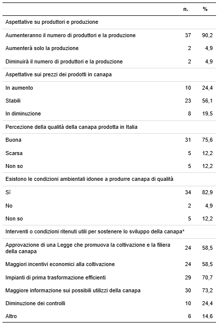 Molto interessante è l’analisi delle risposte alla domanda sulle condizioni o sugli interventi ritenuti utili per sostenere lo sviluppo del settore della canapa. Per il 73,2% dei produttori è necessaria una maggiore informazione sia dei consumatori, sia dei produttori sui possibili utilizzi della canapa e il 70,7% segnala la necessità di impianti di prima trasformazione. Quest’ultimo aspetto risulta senza dubbio di cruciale importanza per il potenziamento della canapicoltura italiana, come confermato dalla rilevanza attribuita dal 58,5% degli intervistati alla Legge attualmente in discussione in Parlamento che ha come obiettivo proprio quello di promuovere una filiera agroindustriale della canapa.