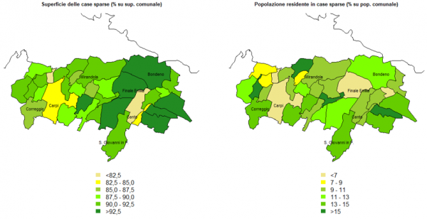 Rispetto a questa tassonomia, le ‘case sparse’ rappresentano una proxy delle porzioni rurali dei rispettivi territori comunali, poste al di fuori dei principali nuclei abitatati. Proprio i danni osservati in queste sezioni di censimento approssimano i danni agli edifici rurali, in un’area, come quella colpita nel 2012, che presenta forti elementi di urbanizzazione. In realtà, rispetto a quest’ultima caratteristica, si può evidenziare una relativa eterogeneità tra i comuni emiliani considerati. Concentrando l’attenzione unicamente sui 32 comuni emiliani più colpiti dal sisma (e individuati dal D.L. 74/2012, con l’esclusione della città di Ferrara), si nota come l’incidenza delle case sparse sul totale sia molto differenziata in termini di superficie e popolazione residente. Da un lato, la superficie coperta dalle case sparse supera ovunque l’80% del totale comunale, ma sono soprattutto i comuni della parte più orientale quelli in cui tale incidenza risulta maggiore. Dall’altro, la popolazione residente in queste sezioni non supera, in media, il 12-15% del totale comunale. Il dato, come previsto, è mediamente ancora più basso nei comuni più popolosi dell’area (Figura 2).
