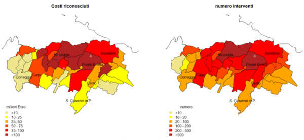 Figura 3 – Danni nei comuni più colpiti dal sisma del 2012: numero di interventi e costi dichiarati (riconosciuti), a livello comunale