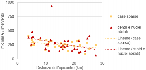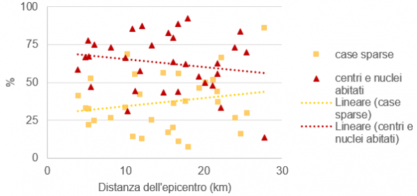 Rispetto al dato medio, poi, è possibile notare come proprio i comuni relativamente più lontani dall’epicentro si caratterizzino per una maggiore incidenza dei danni agli edifici rurali sul totale. Il dato sembra suggerire che, a fronte di una maggior livello complessivo dei danni (nelle aree centrali), la devastazione nei centri storici è tale da limitare notevolmente l’incidenza dei danni alle case sparse. Al contrario, laddove i danni sono risultati complessivamente più contenuti (le aree più lontane dall’epicentro), risulta più significativa la quota di danni alle case sparse. Tale lettura, che sembra testimoniare una maggiore debolezza strutturale delle porzioni rurali del territorio, richiede conferma con un’analisi dei dati comunali rispetto alla distanza relativa dall’epicentro.