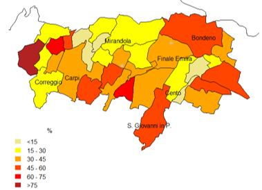 Rispetto al numero complessivo di interventi, la situazione è in parte differente qualora si consideri l’incidenza percentuale dei danni agli edifici rurali (case sparse) rispetto al totale comunale. La figura 4, infatti, mostra un andamento opposto: in genere, i danni agli edifici rurali rappresentano in molti casi oltre il 30% dei danni complessivi. Questi dati confermano un’elevata vulnerabilità dei territori rurali al sisma, anche nell’area emiliana. A fronte di una popolazione inferiore al 15% del totale comunale (come osservato in figura 2), i danni registrati alle case sparse risultano ben più elevati in termini percentuali.