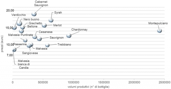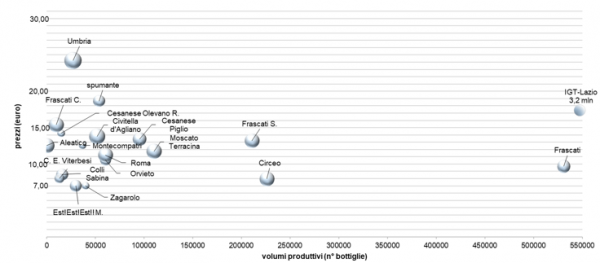 Ciò che balza subito agli occhi è l’assenza di Doc importanti, quali il Castelli Romani ed il Marino. Inoltre, è anche evidente come la maggior parte di questi vini sono prodotti in piccole quantità. Fanno eccezione, la Igt-Lazio (più di 3 milioni di bottiglie, per questo collocata fuori scala sul grafico), il Frascati ed il Circeo (ciascuno con poche centinaia di migliaia di bottiglie).