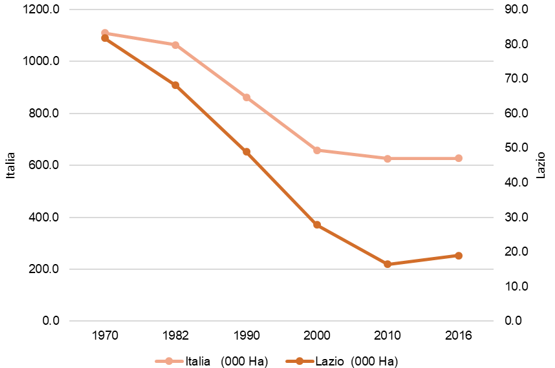 Figura 2 - Evoluzione delle superfici vitate: Lazio - Italia a confronto