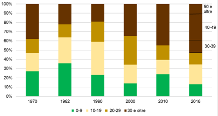 Un tale ridimensionamento ha probabilmente generato cambiamenti nella natura e nella qualità della base produttiva. In primo luogo muta l’età degli impianti. La figura 3 mostra la composizione demografica del vigneto Lazio fra il 1970 ed il 2016. Partendo dalla situazione attuale, si nota come più della metà degli impianti abbia un’età superiore ai 30 anni. Di questa porzione la quota prevalente ha addirittura una età compresa fra i 40 ed i 49 anni (circa 29,2% del totale), mentre il 10,7% ha più di 50 anni2.