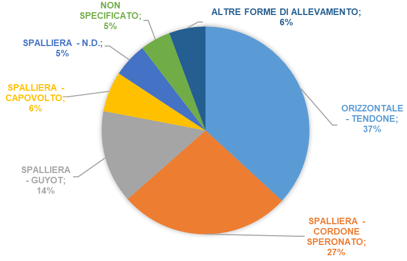 Questi impianti, risalenti ai decenni addietro, sono stati realizzati con obiettivi ed utilizzando tecniche colturali e conoscenze agronomiche molto diverse rispetto a quelle attuali. Ciò spiega, fra l’altro, la diffusione del sistema di allevamento a Tendone orizzontale (37% nella media regionale ma con una incidenza più marcata nella provincia di Roma e Latina). Si tratta di una soluzione orientata più alla produzione qualitativa che quantitativa (www.enoguida.com) e che rende maggiormente problematica la meccanizzazione; oggi nei contesti vitivinicoli dell’Italia centrale le forme di allevamento orizzontale sono poco favorite rispetto alle forme di allevamento verticali, infatti come si evidenzia nella figura 4 i sistemi più adottati sono quelli a Cordone speronato (adottato nel 27% circa dei vigneti regionali), la Spalliera-Guyot (presente con il 14%), la spalliera a capovolto (con il 6%) ed altre forme di allevamento (pari al 15%).