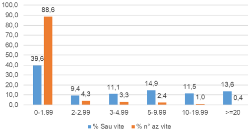 La situazione fin qui descritta, caratterizzata da una stasi degli investimenti e da un complessivo declino della base produttiva è dipesa dalla complessità legata all’agire di diversi fattori. In primis, la polverizzazione delle aziende: circa 20 mila vigneti sono ben sotto la soglia dell’ettaro (Figura 5). Fra gli altri elementi, che giocano un ruolo importante nel limitare i livelli di efficienza e competitività del settore, ne vanno citati brevemente alcuni: i) l’intensa competizione nell’uso delle risorse (in primo luogo il terreno), soprattutto nell’area romana; ii) l’effetto distorsivo esercitato dalle politiche4 iii) le vicende della cooperazione regionale.