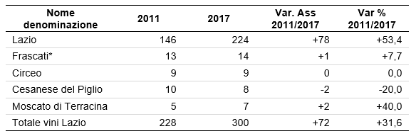 Tabella 2 - Denominazioni laziali in Veronelli: 2011 e 2017