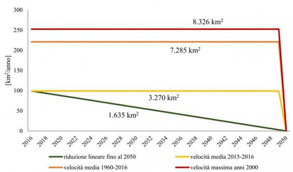 Il 5° Rapporto Ispra sul consumo di suolo in Italia ha fornito sia dati sul consumo di suolo avvenuto dagli anni ’50 ad oggi, sia scenari per il futuro al 2050 (Ispra, 2018). Ispra delinea quattro diversi scenari (Figura 1); il più ottimista indica una perdita di 81.800 ettari di suolo, come conseguenza di una progressiva e continua riduzione della velocità di cambiamento dell’uso del suolo, dovuta a provvedimenti normativi significativi e applicazioni conseguenti. Se invece il tasso di consumo rimanesse costante fino al 2050, ed uguale a quello verificatosi nel 2017, si rischierebbe di perdere 167.200 ettari di suolo. Gli scenari peggiori ipotizzano due diverse velocità di consumo di suolo fino al 2050, una pari ai valori medi e l’altra a quelli massimi registrati negli ultimi decenni. Nel primo caso si avrebbe una perdita di suolo di 706.400 ettari e nel secondo caso di 807.300 ettari.