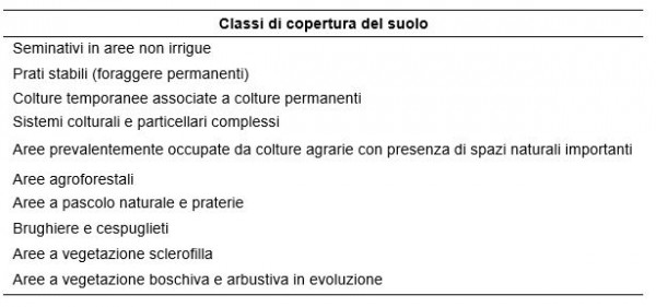 Tabella 1 - Classi di copertura del suolo considerate potenzialmente occupabili dal bosco