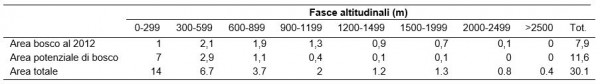 Tabella 3 - Ripartizione delle aree boscate e potenzialmente occupabili dai boschi per fasce altitudinali. Dati espressi in milioni di ettari