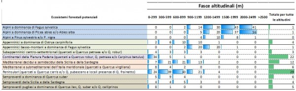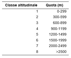 Sovrapponendo la carta delle aree potenzialmente occupabili dai boschi con la carta della Vegetazione Naturale Potenziale (Vnp) (Blasi, 2010) è stato inoltre possibile definire il tipo di vegetazione che potrebbe insediarsi su tali superfici. Eliminando successivamente le superfici potenzialmente adatte alla sola vegetazione erbacea o arbustiva (ad esempio le praterie di alta quota), è stato possibile identificare le superfici potenzialmente occupabili dalla sola vegetazione forestale. L’ultimo step è stato di sovrapporre la carta dell’espansione forestale potenziale con quella delle fasce altimetriche, generata a partire dal Modello Digitale del Terreno a 20 metri di risoluzione e successivamente suddivisa secondo le fasce altimetriche definite dall’Istat (Tabella 2).