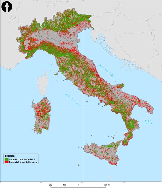 Mentre i boschi continuano ad aumentare, arrivando a coprire quasi il 40% del territorio italiano, altrettanto fanno le superfici artificiali che fanno registrare un continuo e significativo incremento. Da oltre mezzo secolo questi due fenomeni sono i protagonisti dei processi di trasformazione del paesaggio e ci sono valide ragioni per credere che possano continuare ad esserlo ancora per diversi anni a venire. Questo studio ha lo scopo di offrire un quadro sinottico delle principali dinamiche del paesaggio negli ultimi tre decenni, provando inoltre a fornire uno sguardo d’insieme su un futuro ipotetico in cui l’agricoltura dovesse cedere il passo alle aree boscate. Tramite un approccio cartografico e la sovrapposizione di diversi strati informativi, è stata dunque identificata la superficie potenzialmente ancora occupabile dal bosco, cercando altresì di caratterizzare da un punto di vista tipologico tali popolamenti potenziali.