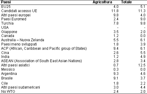 Per quanto riguarda il MTRI, questo indicatore si basa sull’idea che una politica commerciale possa essere valutata usando il volume di commercio come termine di riferimento. In pratica, il modello calcola quale sarebbe la tariffa uniforme che, qualora fosse applicata al posto della struttura tariffaria esistente, manterrebbe costante il valore delle importazioni provenienti da un altro paese (Antimiani e Salvatici, 2005). Gli indici di protezione bilaterale sono stati calcolati sia a livello aggregato sia per i principali comparti produttivi: agricoltura, industria e servizi.