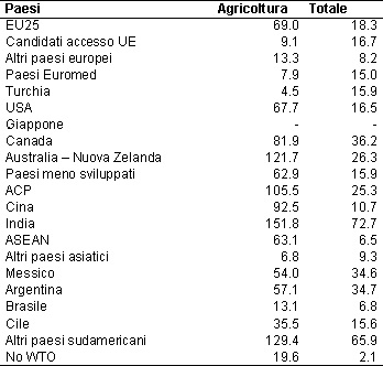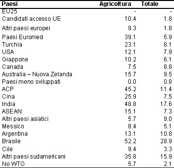 Le tabelle seguenti riportano – con riferimento ai tre paesi presi in considerazione: USA, Giappone e UE – le tariffe uniformi equivalenti, calcolate a livello bilaterale, corrispondenti al totale delle importazioni o alle sole importazioni agricole.
