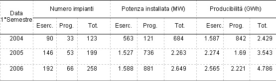 Lo sviluppo delle biomasse per la produzione di energia elettrica su larga scala è piuttosto recente, sia per la mancanza di informazione e consapevolezza sulle bioenergie, sia per le caratteristiche del mercato nazionale dell’energia (liberalizzato dal 1° luglio 2007), sia per la politica di supporto che solo da pochi anni è passata da incentivi riconosciuti in tariffa (modello CIP 6/92) a un sistema di mercato basato sui Certificati Verdi (CV). L’energia producibile da impianti alimentati a biomasse, biogas e rifiuti (Tabella 3) copre circa il 25% del totale prodotto dagli impianti alimentati a fonti rinnovabili. Nel 2006, l’immissione nel sistema elettrico della quota obbligatoria di energia rinnovabile o di Certificati Verdi equivalenti è stata pari al 3,05% dell’energia prodotta da fonti convenzionali, import incluso.