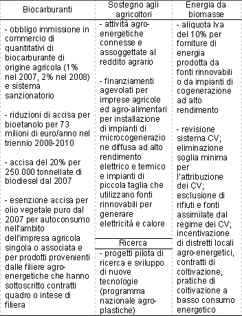 La finanziaria 2007 che attua, tra l’altro, gli obiettivi programmatici contenuti nel Dpef 2007-2011 in tema di fonti energetiche rinnovabili, ha definito un quadro organico di interventi per lo sviluppo della filiera agro-energetica, dall’agricoltura all’industria di trasformazione, da realizzare anche per il tramite di decreti attuativi, leggi collegate e deleghe all’esecutivo (Tabella 4), che pone i presupposti per l’attivazione e lo sviluppo di filiere che si realizzino su piccola scala e su base territoriale offrendo vantaggi al mondo agricolo.