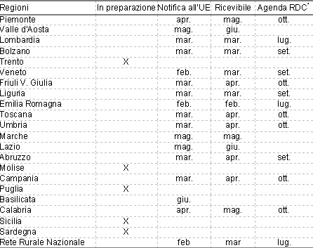 Riguardo all’Italia, come si può osservare dalla Tabella 1, solo sedici PSR sono stati notificati alla Commissione e, di questi, quindici sono stati dichiarati ricevibili. Per i programmi già notificati si prevede l’approvazione tra luglio e dicembre di quest’anno, in ritardo rispetto alla tabella di marcia dell’UE che prevedeva l’approvazione entro giugno.